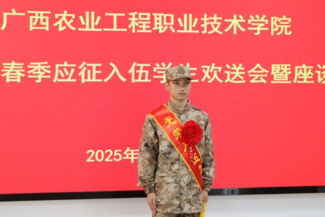李振科代表学校党委和全体师生向应征入伍的同学表达衷心祝贺,并感谢扶绥县人民武装部对我校征兵工作的支持。他对入伍同学提出了四点期望:一要铸牢忠诚之魂,希望入伍同学始终听党指挥,把“绝对忠诚、绝对纯洁、绝对可靠”融入血脉,做党和人民的忠诚卫士。二要苦练胜战之能,作为大学生士兵,要发挥专业优势,在信息化、智能化训练中勇当先锋,争做“科技强军”的实践者。三要永葆奋斗之志,以“一不怕苦、二不怕死”的战斗精神,在艰苦环境中磨砺意志,在平凡岗位上创造不凡。四要传承母校之魂,作为农工院的学子,当牢记“崇德尚学,精技为农”的校训精神,无论走到哪里,都要以“农工人”的标准要求自己,用实际行动为母校增光添彩!