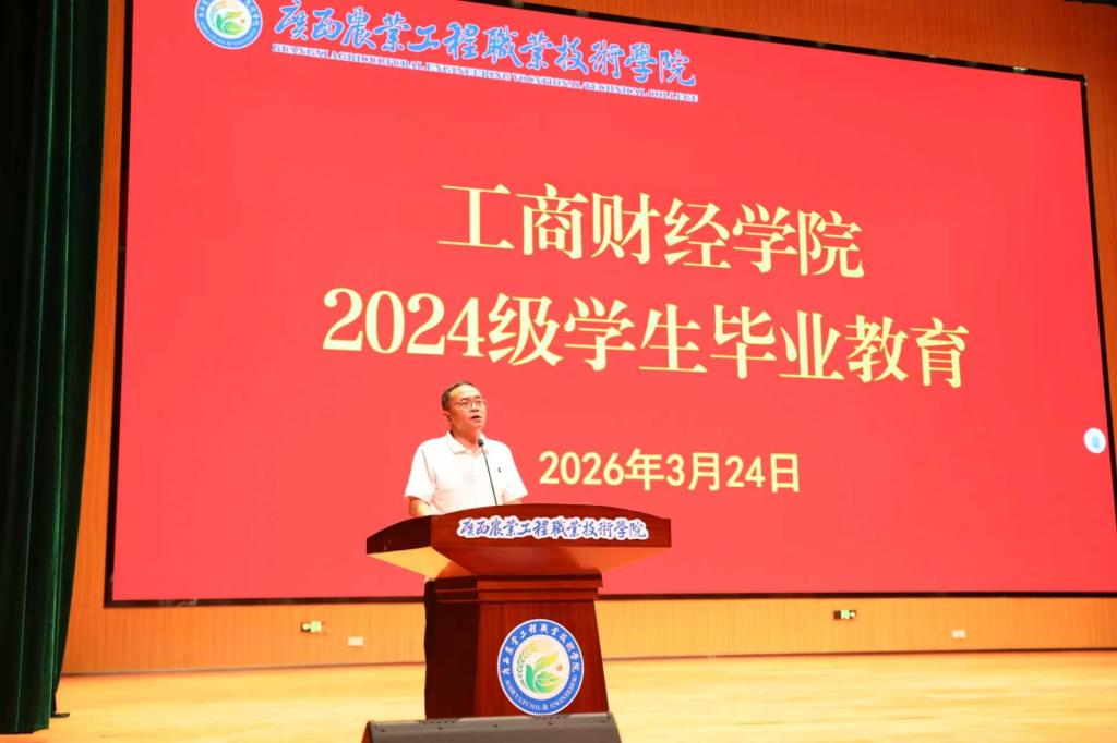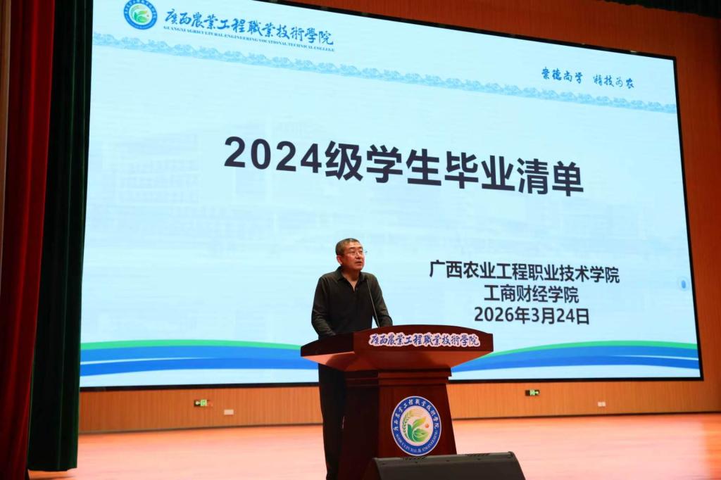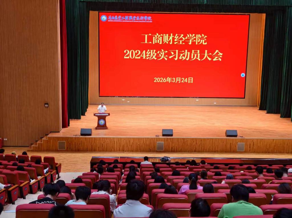 为扎实推进 2024 级学生实习管理与毕业设计工作,明确实习全流程要求与学业任务节点,助力学生从校园平稳迈向职场,3 月 24 日 ,广西农业工程职业技术学院工商财经学院在学术交流中心召开 2024 级学生实习动员大会。学校总会计师韦炜,工商财经学院副院长范飞飞,学院 2024 级全体辅导员、班主任、实习指导老师及 2024 级大数据与会计、电子商务、供应链运营三个专业的全体学生参会。