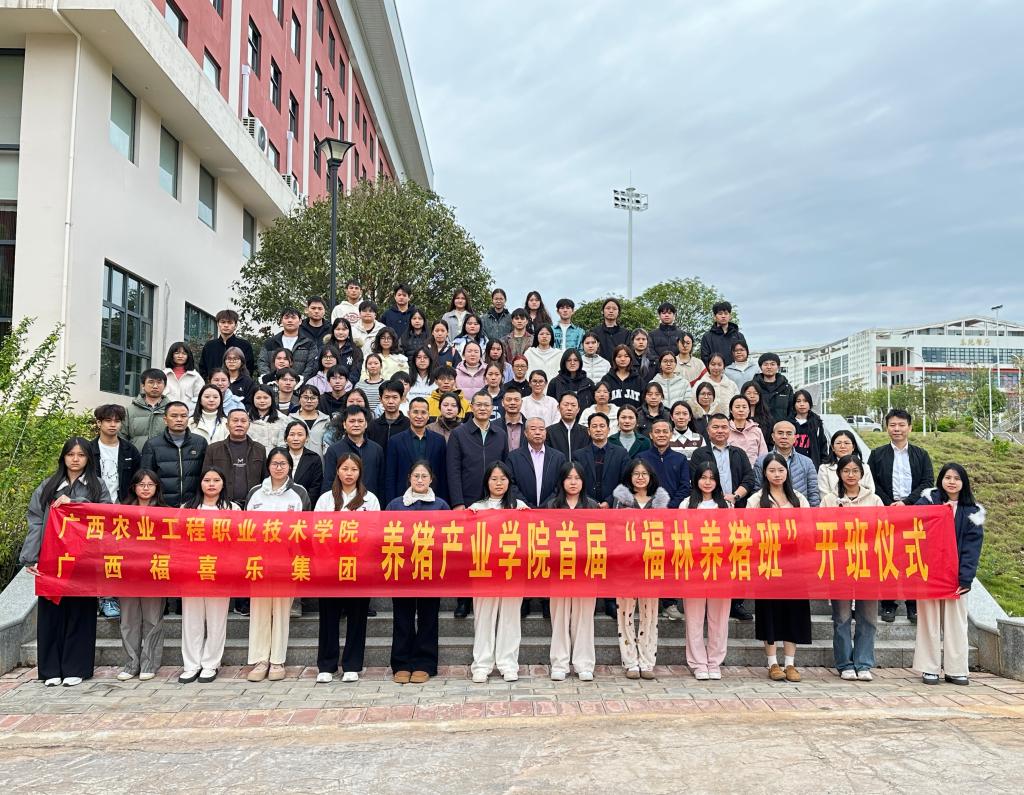 11月19日下午,我校与广西福喜乐集团合作共建的首期“福林养猪班”顺利开班。学校副校长莫嘉凌,广西福喜乐集团董事长黄定寿、总裁刘国华,广西大学教授、原广西生猪首席科学家兰干球,学校动物科技学院院长及师生代表共同出席开班仪式。