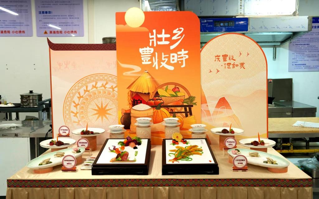本次学校参赛队伍由陈包中、侯代冬、吴鑫琪、钟雨恒四位同学组成,在指导老师的精心指导下,历经多轮打磨与备赛,最终获取荣誉。参赛项目以“壮乡丰收时”为主题,深度聚焦广西地理标志性农产品,以烹饪工艺学为基础,巧妙融合壮族饮食文化、非物质文化遗产技艺与农产品研发。项目不仅展现了精湛的烹饪专业水平,更通过壮族蛙形舞姿、五色糯米饭、花山岩画等文化符号,打造“舌尖上的壮乡”特色作品,实现了饮食文化传承与乡村振兴理念的多维呈现。