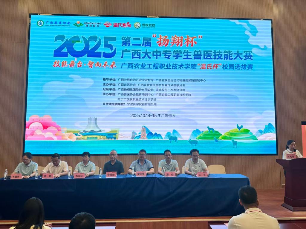 10月14—15日,2025年第二届“扬翔杯”广西大中专学生兽医技能大赛“温氏杯”校园选拔赛在我校成功举办。学校副校长李祖培、广西兽医协会会长黄伟坚、副秘书长韦英益、常务理事潘杰,教育培训中心主任韦碧燕,温氏股份广西养猪公司经理杨鹏、宁波舜宇仪器有限公司华南区经理王冬以及学校动物科技学院专业教师出席了启动仪式,会议由动物科技学院副院长主持。