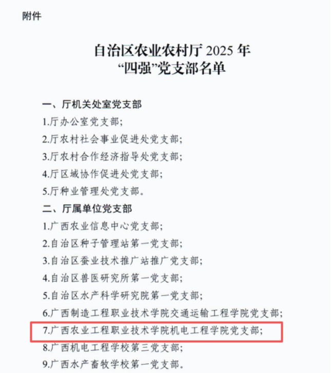 近日,中共广西壮族自治区农业农村厅直属机关委员会印发《关于公布自治区农业农村厅2025年“四强”党支部名单的通报》,机电工程学院党支部经过严格评审,凭借突出的党建工作实绩,成功获评自治区农业农村厅2025年“四强”党支部荣誉称号。