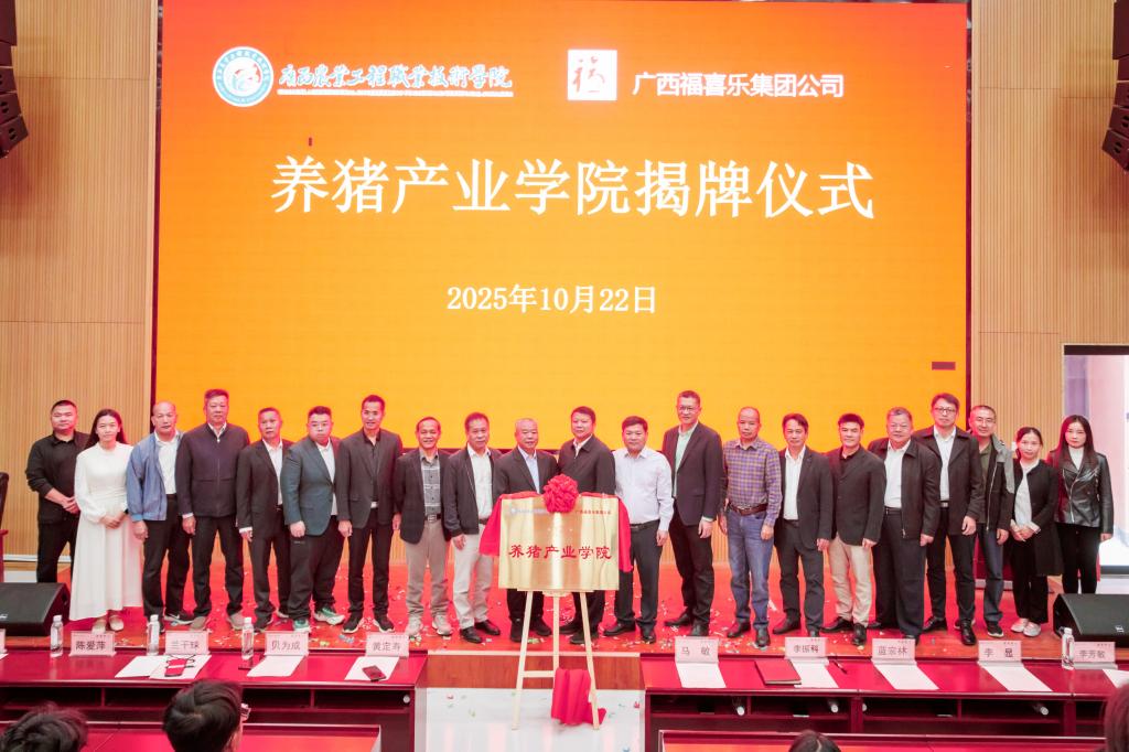 10月22日上午,我校与广西福喜乐集团共建的“养猪产业学院”揭牌仪式在7号阶梯教室隆重举行。